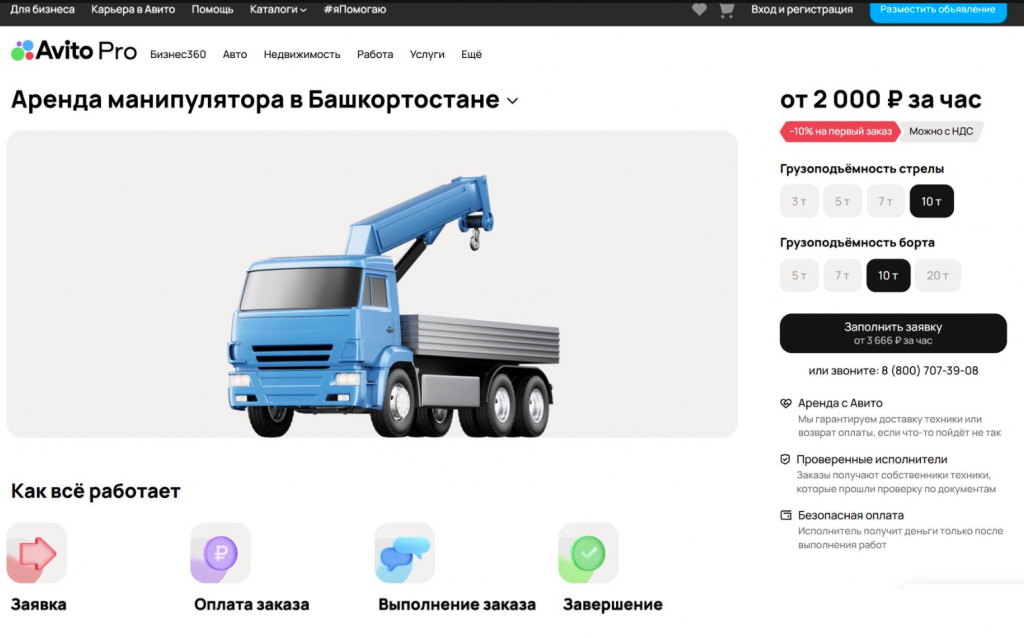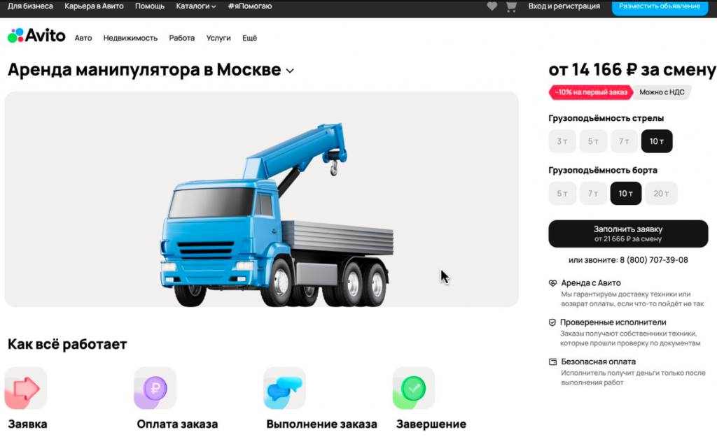 Цена за аренду, которую заказчики видят в заявке, стартовая. Она не учитывает дополнительные параметры, которые влияют на стоимость работы. Например, если в конструкторе заказа уточнить грузоподъёмность, стартовая цена изменится и отобразится на кнопке «Заполнить заявку». А если ввести точный адрес работ, цена может поменяться с учётом доставки техники.